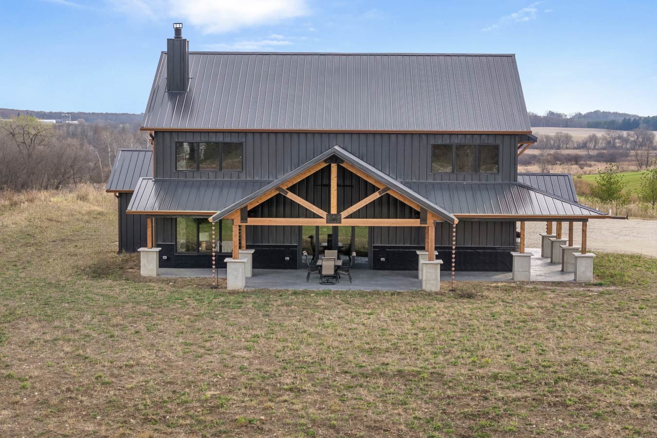 The exterior makes an equally bold statement. The black steel siding pairs with cedar trusses, columns, and gable accents to highlight the wraparound porch and custom overhead workshop doors, creating a seamless blend with the countryside setting.