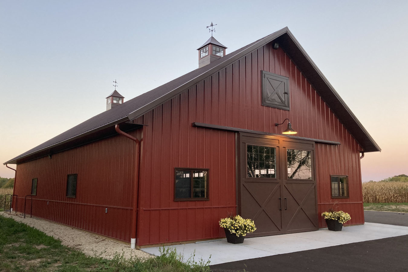 This custom post frame building stands out for its meticulous attention to detail and personalized touches. It includes four practical overhead doors on the side wall and an additional overhead door on the back-end wall, enhancing accessibility. The front façade is adorned with our elegant Touch of Class sliding doors, two strategically placed windows, a decorative hay loft door, and thoughtfully placed exterior lighting above the main entrance.