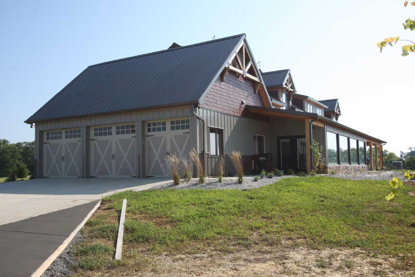 This custom post-frame home features a timber frame structure with exposed trusses and post-and-beam elements that define both the exterior and interior aesthetic.