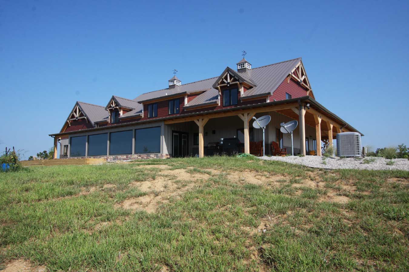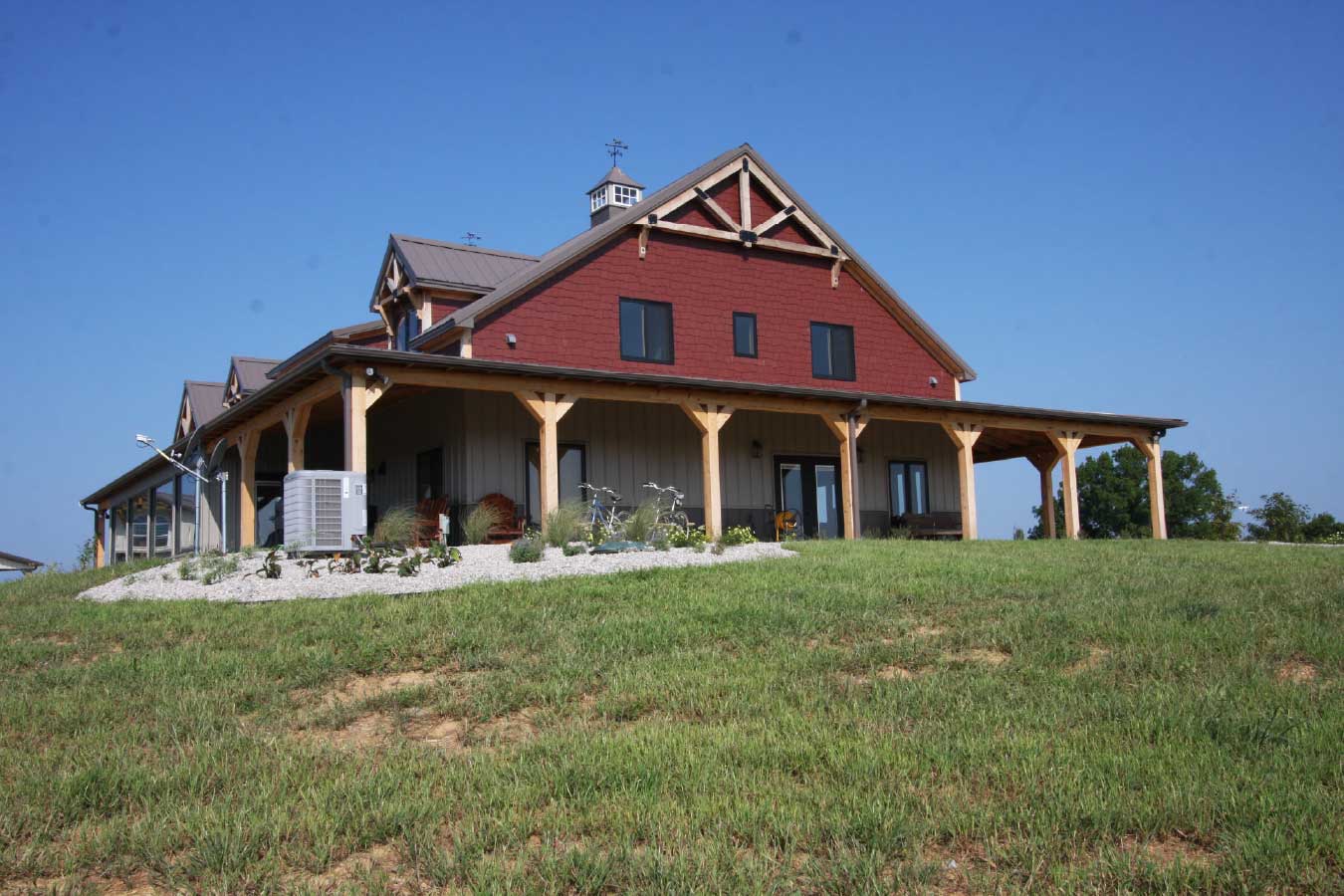 Rear view of timber frame home with wraparound porch in rural Kentucky setting