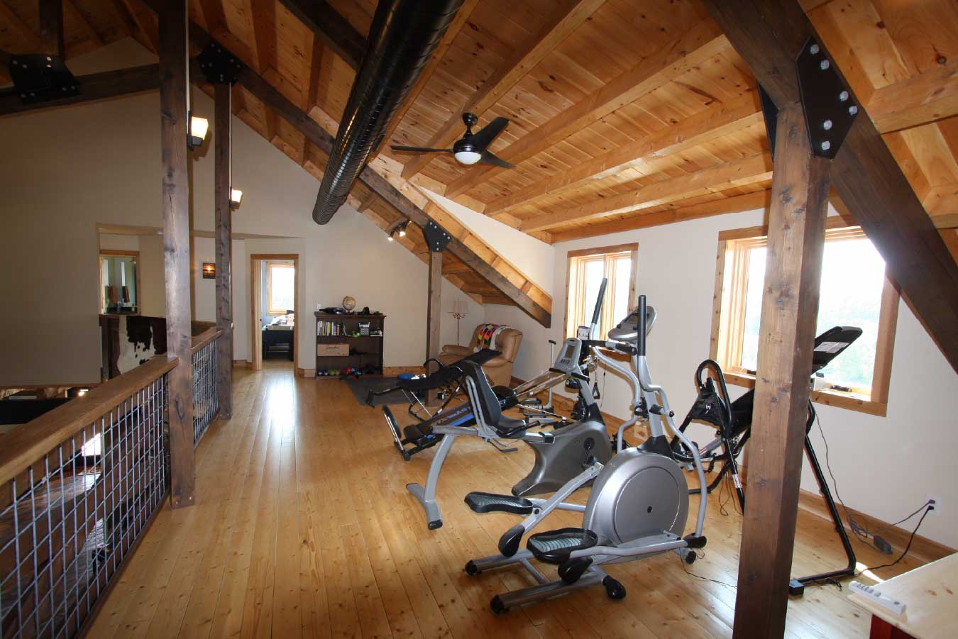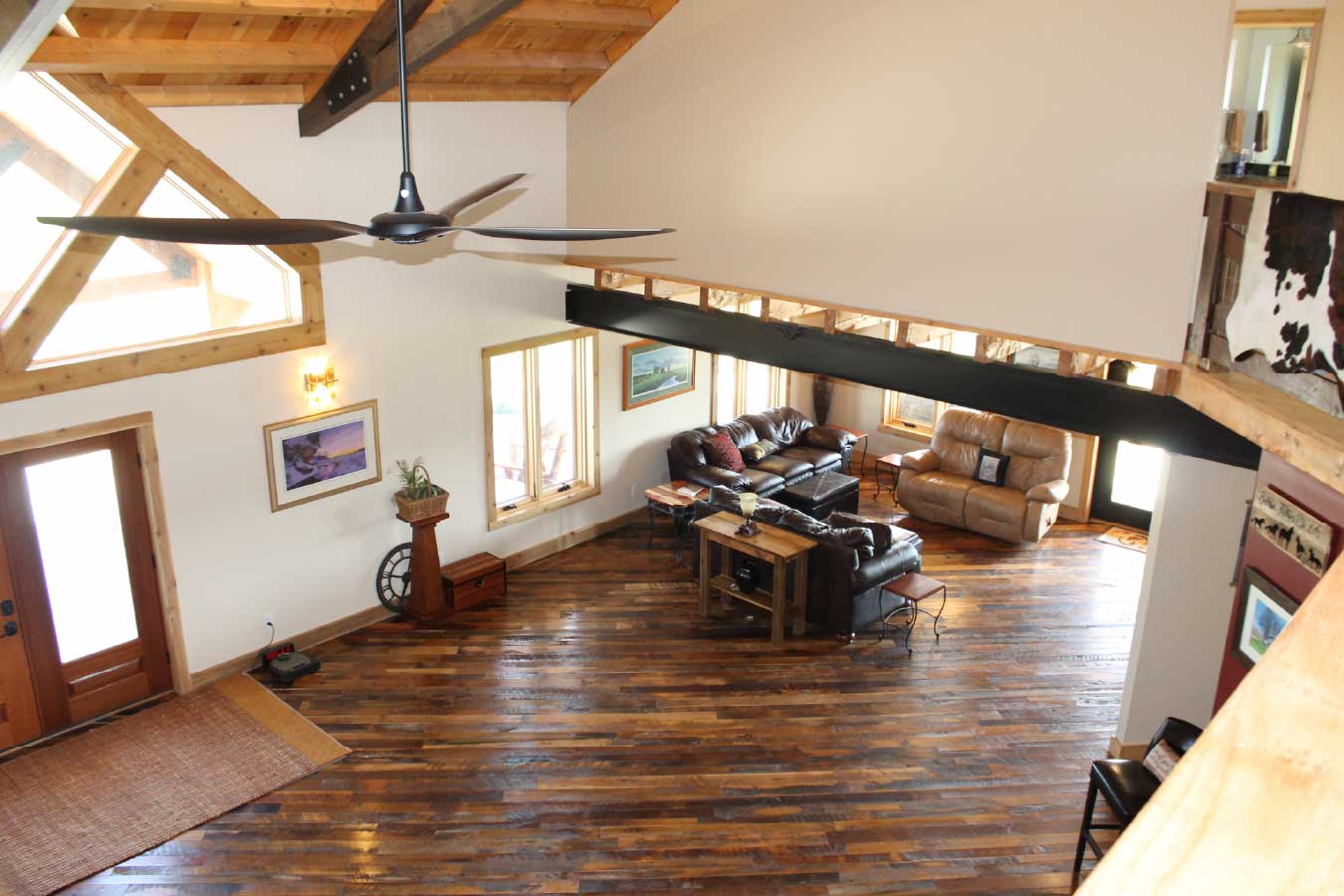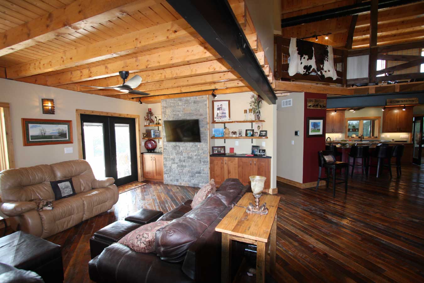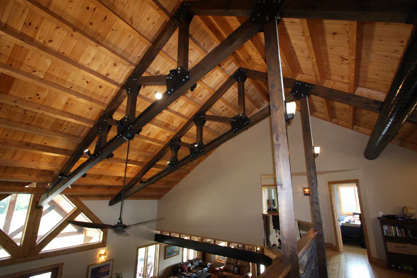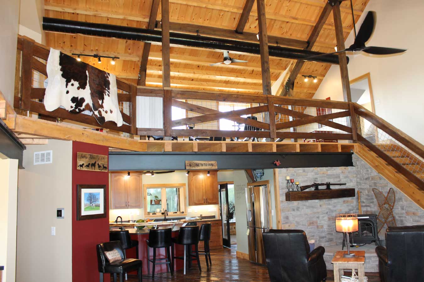 Open-concept timber frame interior with loft, exposed trusses, and vaulted ceiling
