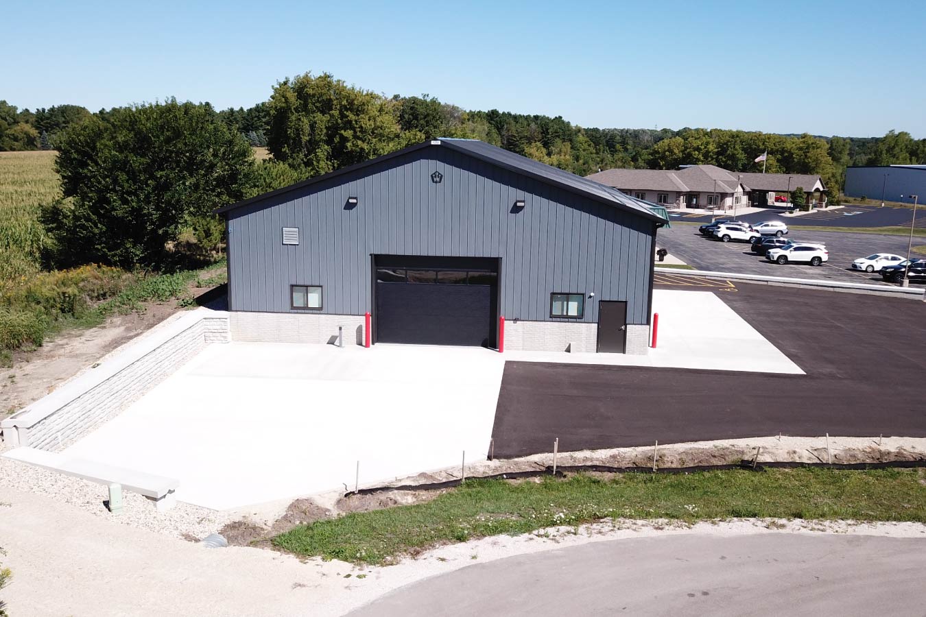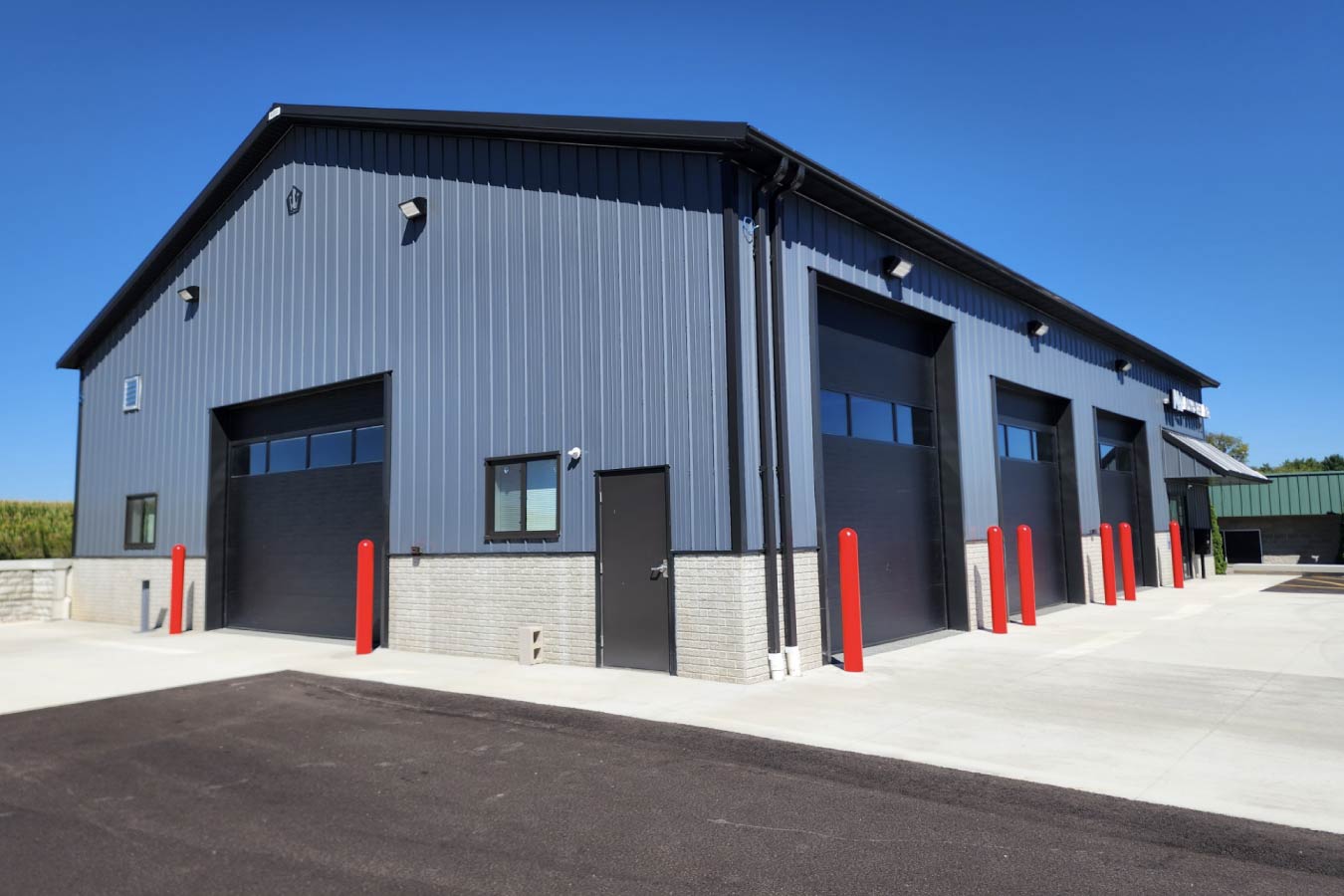 Built with JWS charcoal steel siding and black trim, the exterior is accented with red bollards to protect the structure during vehicle entry. The result is a space that’s not only built to perform, but built to last, providing Matt and his team a solid foundation for success for decades to come.